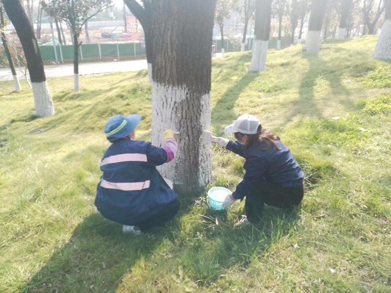 树木刷白不仅可以反射过多的阳光,降低树干昼夜温差,防止树木主干被冻伤,起到防寒保暖的作用,还能有效抑制虫卵、细菌,为树木来年的生长提供良好的条件。截至目前,累计出动工作人员30余名,已对白鹿广场、天鹅湖广场等广场3885棵景观树及行道树进行了刷白工作。刷白工作中,工作人员严格按照比例配置刷白液比例,统一树木刷白高度,刷白后的树木整齐美观,成为广场一道靓丽的风景线。