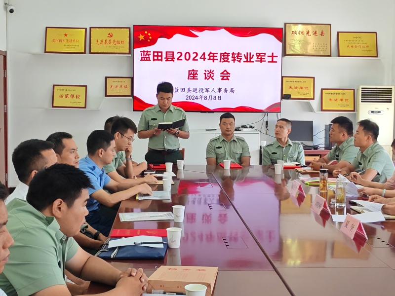 为优化服务保障工作,为转业军士量身定制人才安置计划,实现精准设岗和人岗相宜,有效推动军事人才向社会经济人才的转变,8月8日上午,蓝田县退役军人事务局组织召开2024年度转业军士座谈会。会议由县退役军人事务局党组成员、副局长夏奎主持,2024年符合政府安置工作条件的转业军士参加了会议。