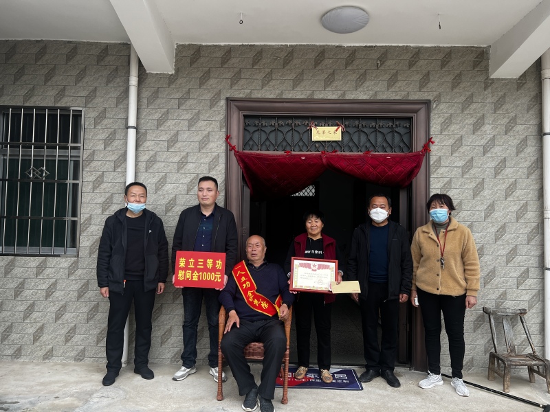下午,县退役军人事务局相关负责人来到荣立三等功的现役军人杜剑勃家中,为现役军人家属披上绶带、宣读喜报,送上1000元慰问金,并对其在部队荣立军功表达了衷心的祝贺和崇高的敬意。
