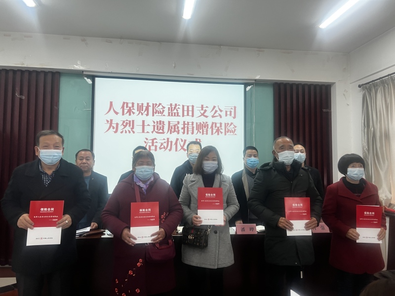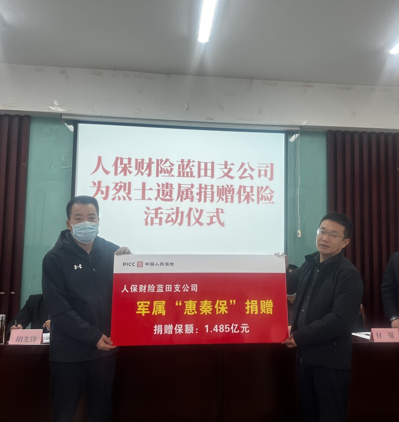 11月17日上午,“惠秦保”保险捐赠仪式在县退役军人事务局如期举行,县退役军人事务局、县金融办、人保财险蓝田支公司负责人,以及全县33名烈士遗属代表参加。此次活动是经县退役军人事务局联系对接,由拥军爱心企业人保财险蓝田支公司自行出资,为烈士遗属全家购买了总保值达1.485亿元的“惠秦保”大病保险。