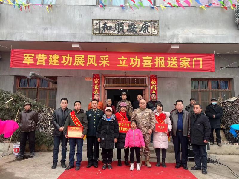 县人民武装部政委,县退役军人事务局局长,普化镇党委书记及镇、村相关负责同志,陪同解放军某部政治工作部相关同志,来到普化镇下杨寨村,为家住该村的现役军人李鹏飞送去三等功立功喜报及1000元慰问金。