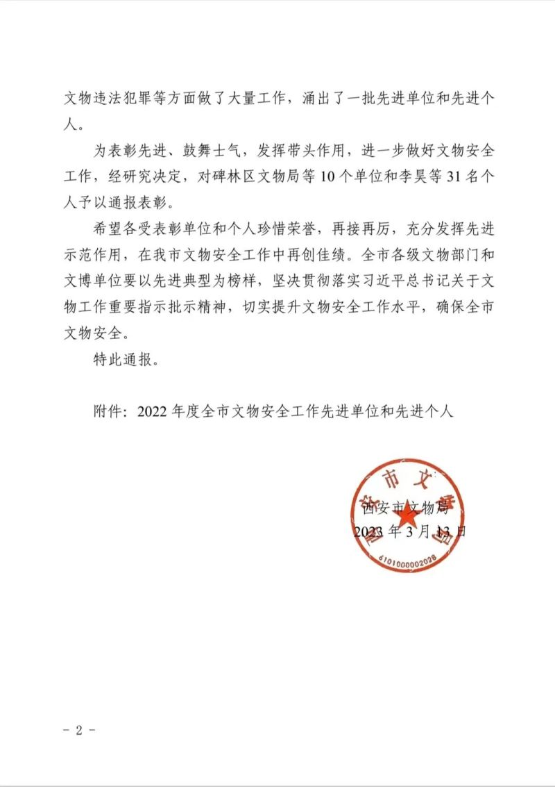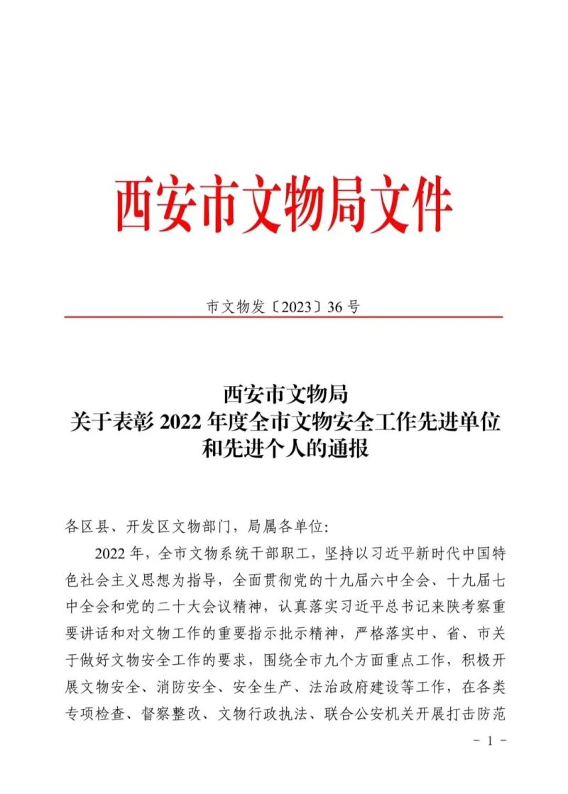 3月13日,西安市文物局公布了2022年全市文物安全工作先进单位和先进个人,蓝田县文物局入选全市文物安全工作先进单位。