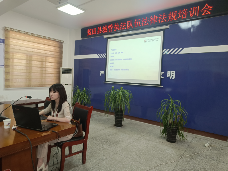 会议邀请蓝田县城管局法律顾问、陕西法智律师事务所律师王馨怡进行授课,王律师以推进依法行政、文明执法为主题开展专题讲座,她从依法行政的要求、具体措施及必要性讲起,结合《陕西省城市管理综合执法条例》相关规定,从执法队员要推进执法规范化,严格执行执法人员持证上岗,认真落实行政执法公示制度、执法全过程记录制度、重大执法法定法制审核制度等方面进行了详细的讲解,杜绝粗暴执法、过激执法,让执法既有力度,又有温度。