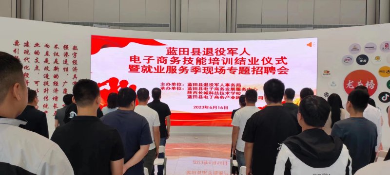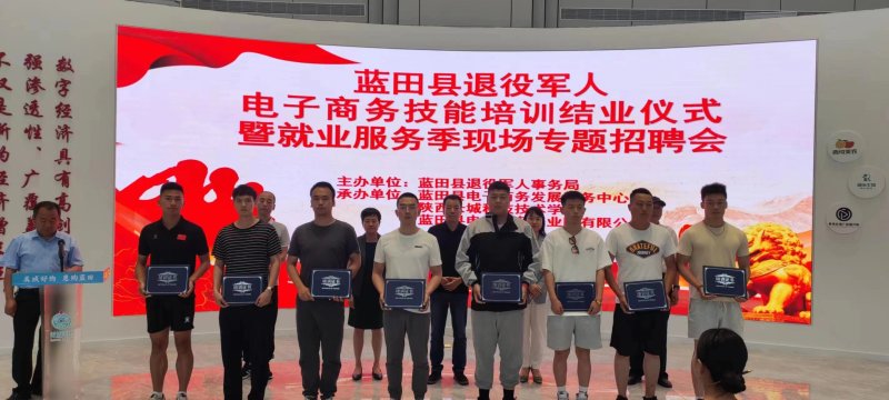 为进一步深入贯彻落实习近平总书记关于退役军人工作重要论述精神,大力提升退役军人技能本领,充分搭建就业创业平台,全面做实做细退役军人就业创业工作,6月16日下午,按照蓝田县退役军人就业创业“人才接收+意愿培训+岗位定制+无忧就业”全链条全免费一条龙无缝隙的新模式计划,蓝田县举行退役军人电子商务技能培训结业仪式暨就业服务季现场专题招聘会。县退役军人事务局、县电子商务发展服务中心、陕西长城科技技术学校负责同志,县电子商务产业园有限公司副总经理等出席仪式。部分电子商务企业负责人及参训退役军人学员代表现场参加。