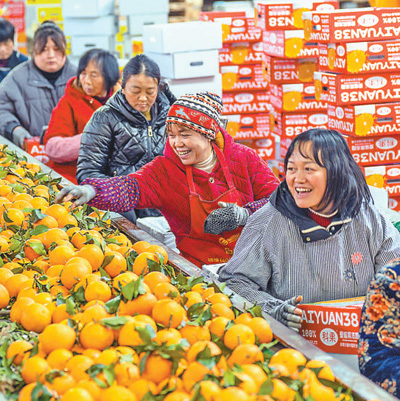 | 四川省眉山市彭山区黄丰镇一家果业公司车间内,村民正在分拣耙耙柑。本报记者 宋豪新摄 |