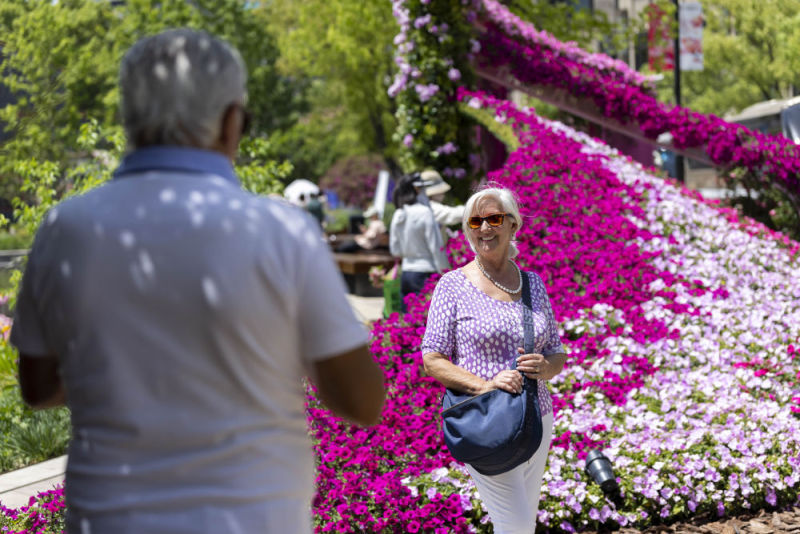 4月18日,外国游客在上海国际花展黄浦新天地主会场留影。新华社记者王翔 摄