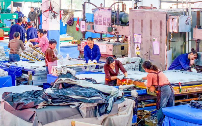 2025年3月20日,在位于江苏宿迁的江苏吉龙运动休闲用品有限公司车间,工人在生产线上赶制体育用品海外订单(无人机照片)。新华社发(陈少帅摄)