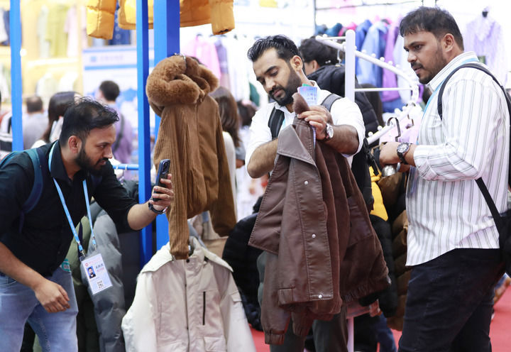 2025年5月1日,在广州开幕的第137届广交会第三期上,境外采购商在一家服装企业的展区拍摄样品。新华社记者 王瑞平 摄