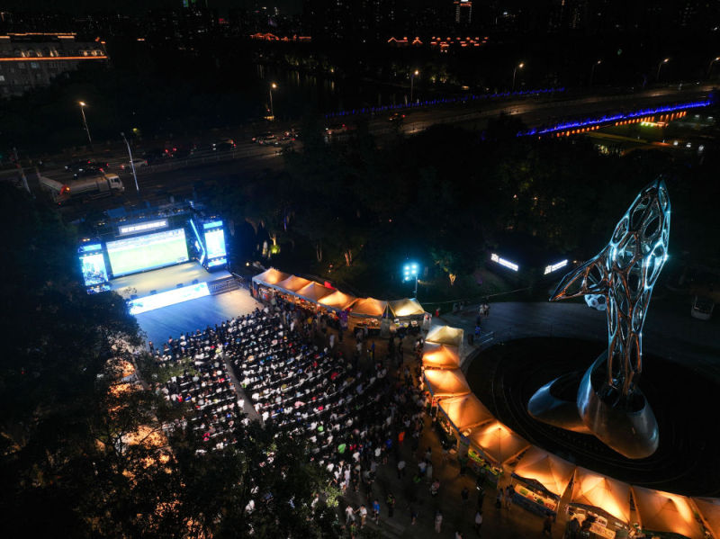 8月17日,在江苏南京举行的2025江苏省城市足球联赛第九轮比赛中,南京队对阵盐城队。南京市在部分商场、街区等地设置观赛“第二现场”,使用大屏幕同步直播赛事,同时设有游戏互动区、烟火市集区,让球迷们度过欢乐时光。新华社记者 季春鹏 摄