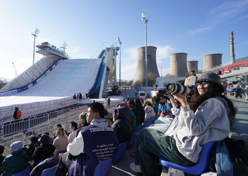 2024年11月30日,观众在首钢大跳台观看2024-2025赛季国际雪联单板及自由式滑雪大跳台世界杯北京站比赛。连日来,多项世界级赛事在“雪飞天”“冰丝带”等北京冬奥会场馆上演,精彩连连。北京冬奥会后,越来越多的冰雪赛事让冰雪流量转化为持续增长的市场价值,一系列高水平赛事在吸引了大量游客前来观赛的同时,拉动了赛事周边消费,让冰雪经济“热起来”。新华社记者 张晨霖 摄