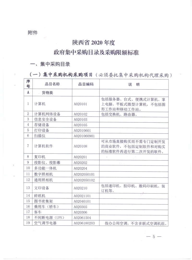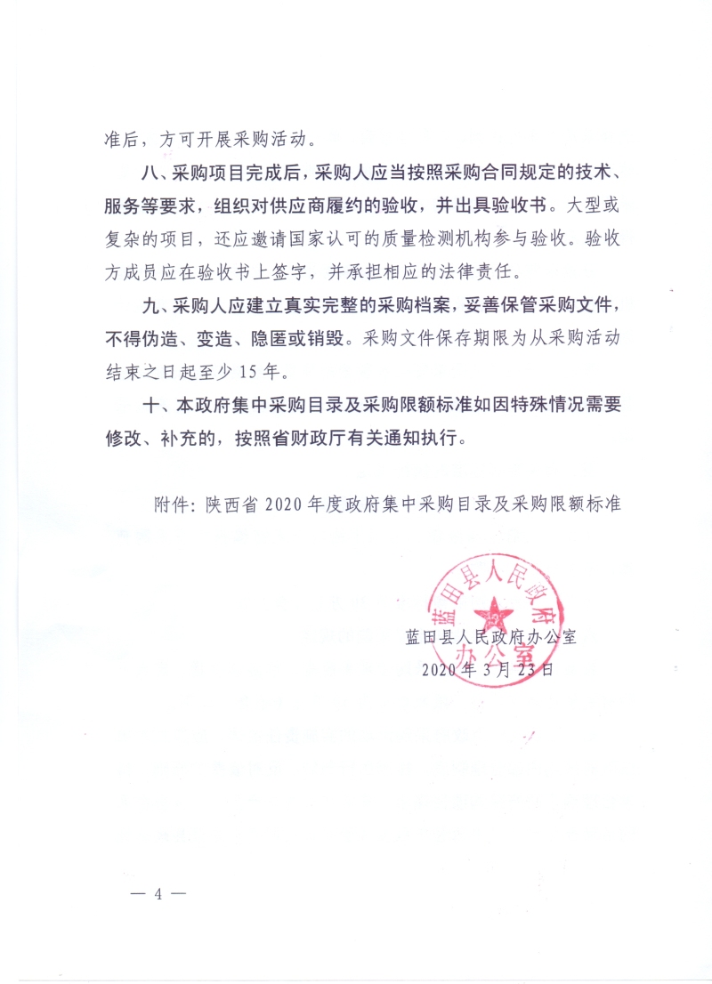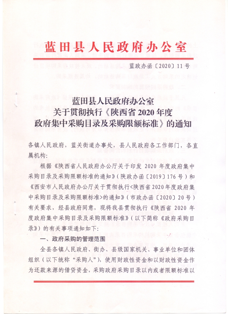 蓝田县人民政府办公室关于贯彻执行《陕西省2020年度政府集中采购目录及采购限额标准》的通知