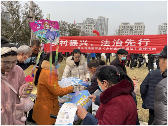 2月5日元宵节当天,蓝田县2023年新春锣鼓大赛活动现场,蓝关司法所开展“乡村振兴,法治先行”乡村振兴促进法宣传活动。白鹿广场上鼓声隆隆,锣响阵阵,热闹非凡,活动现场,蓝关司法所设置宣传点、悬挂宣传横幅,向前来观看锣鼓比赛的群众发放印制的“一张图带您了解《中华人民共和国乡村振兴促进法》”宣传页,同时还发放宪法、民法典、法治蓝田等宣传书籍、彩页。并向群众讲解乡村振兴促进法的重要里程碑意义,普及产业发展、人才支撑、文化传承、生态保护、组织建设等方面知识。现场共发放宣传册、宣传页等宣传资料1000余份,营造了浓厚的法治宣传氛围。