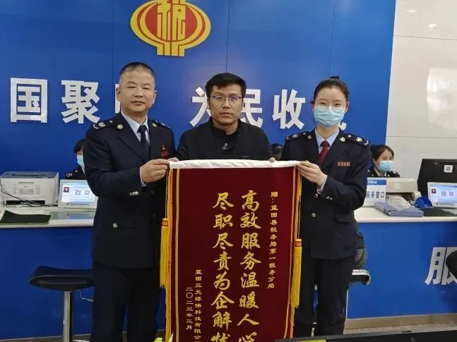 近日,蓝田三元环保科技有限公司办税人柳先生将一面印着“高效服务温暖人心 尽职尽责为企业解忧”的锦旗送到国家税务总局蓝田县税务局办税服务厅,为税务干部热情高效、尽职尽责的延时服务点赞。
