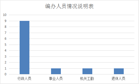 截至2018年底,本部门人员编制11人,其中行政编制11人、事业编制0人;实有人员11人,其中行政9人、事业1人,工人1人,(事业和机关工勤不占编制数)单位管理的离退休人员1人。(人员情况如下图所示)。