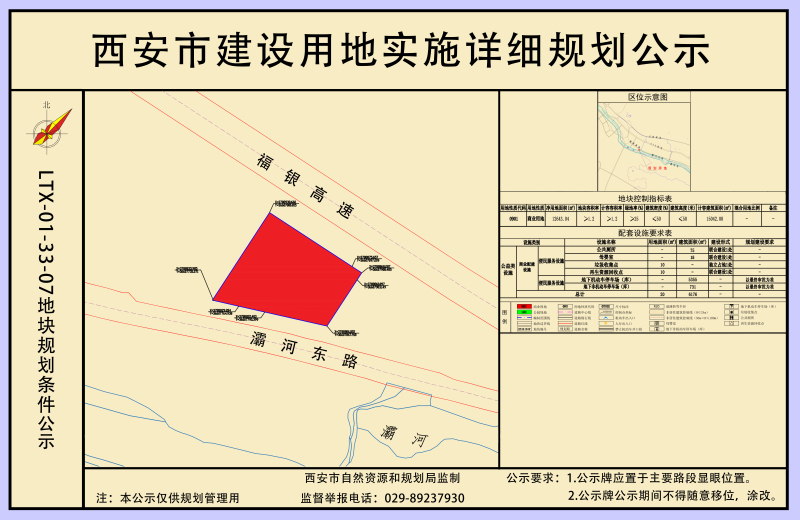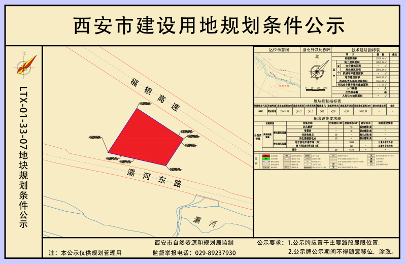 蓝田县华胥镇商业设施用地LTX-01-33-07地块位于蓝田县华胥镇,福银高速南侧,灞河以北,项目净用地面积1.264公顷。《详细规划》确定地块规划用地性质为商业用地(0901),规划指标为:容积率≥1.2、建筑密度≤50%、绿地率≥25%、建筑限高50米;停车位配建按照《蓝田县建设项目停车位配建标准(试行)》执行。