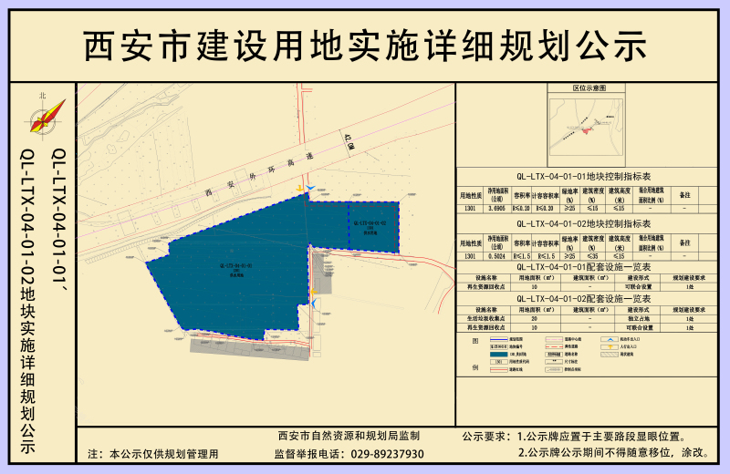 《西安市蓝田县QL-LTX-04-01-01、QL-LTX-04-01-02地块实施详细规划》共涉及两个地块,为QL-LTX-04-01-01和QL-LTX-04-01-02地块,位于蓝田县蓝关街办,西安外环高速以南,黄沟村北部,总净用地面积为41930.10平方米(约合62.894亩),规划用地性质均为供水用地。QL-LTX-04-01-01地块主要指标为:净用地面积36905.20m2,主要规划指标为:容积率≤0.2,建筑密度≤15%,绿地率≥25%,建筑物限高15米;QL-LTX-04-01-02地块主要指标为:净用地面积为5024.90m2,主要规划指标为:容积率≤1.5;建筑密度≤35%,绿地率≥25%,建筑物限高15米。停车位配建按照《蓝田县建设项目停车位配建标准(试行)》执行。