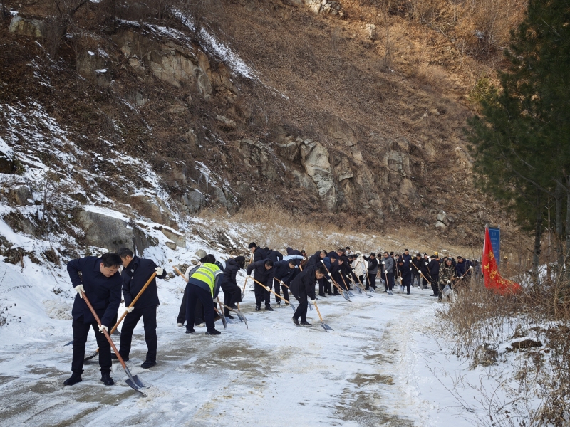 镇政府干部、西十高铁二工区施工人员并肩奋战,组织挖掘机、装载机和皮卡车三台,机械破冰、铁锹铲除、人力清扫等分工明确,配合默契。在凛冽寒风中,参与的干部职工和施工人员都热情高涨,干劲十足,充分展现了团结协作、不畏艰难、为民服务的良好精神风貌。经过数小时的持续奋战,董家岩村至西采峪隧道口段主干道积雪和暗冰得到有效清理,一条安全、整洁的道路重新呈现,有效消除了红门寺片区群众出行的安全隐患。