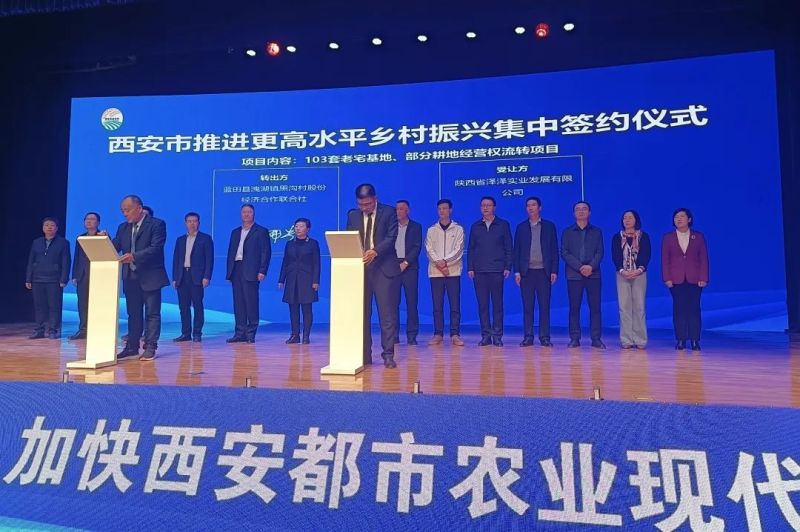 集中签约活动中,我县共签约4个项目。分别是蓝田县洩湖镇黑沟村股份经济合作联合社与陕西省泽泽实业发展有限公司签约103套老宅基地、部分耕地经营权流转项目;蓝田县孟村镇石官寨村股份经济合作联合社与陕西鹿原农业科技有限公司签约68.16亩土地经营权流转项目;蓝田县宣堡村股份经济合作联合社与西安市蓝城堡农业科技发展有限公司签约90亩土地经营权流转项目;西安磨李实业发展有限公司与陕西石羊畜牧科技有限公司签约2.4万头育肥猪养殖项目。
