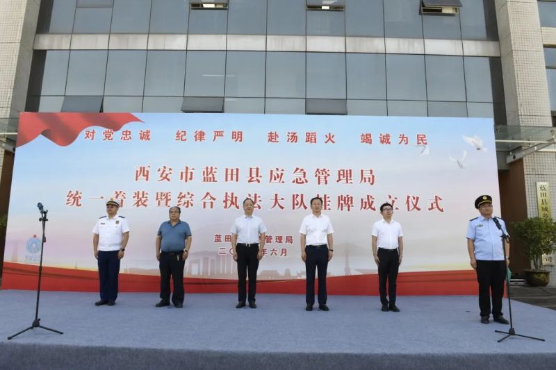 挂牌成立仪式上,县应急管理局全体干部面向国旗庄严宣誓:“坚持执法为民,坚持依法行政,维护公平正义,严守执法纪律。”市应急管理综合执法支队支队长刘永峰和县委常委、副县长苏护强共同为蓝田县应急管理综合执法大队揭牌。