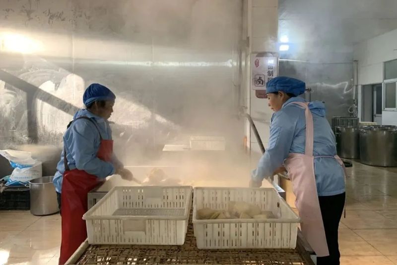 豆干制作时点浆很关键,俗称“点脑”,凭借制作者多年的经验把控,要经历三次点浆过程,有“一点成糊、二点成花、三点成形”说法。点浆时把酸浆缓缓地倒进豆浆里并用勺子不停搅动,豆浆产生变化,先变浑浊,接着用勺子搅拌,浑浊的豆浆慢慢凝结成小颗粒,与水分离,小颗粒越来越多充满整锅,停止倒酸浆。静置20分钟,使蛋白充分凝结。卤制时将豆腐干切成小块放进盛有用酸浆水配制的卤汤的锅里卤煮,煮后烘干,这样反复煮3次即成卤制的豆腐干。