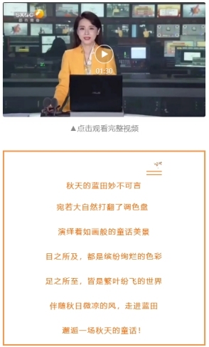 10月11日,陕西广播电视台《都市快报》栏目报道:金秋十月,蓝田秋日美景惹人醉!说不完的秋之美,吟不尽的秋之韵,这令人迷醉的秋日蓝田,是否能满足你对美好的所有想象?原文链接
