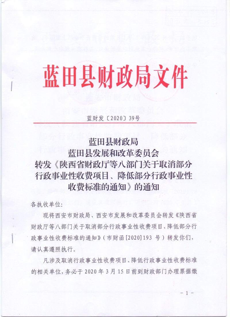 蓝田县财政局、蓝田县发展和改革委员会转发《陕西省财政厅等八部门关于取消部分行政事业性收费项目、降低部分行政事业性收费标准的通知》的通知