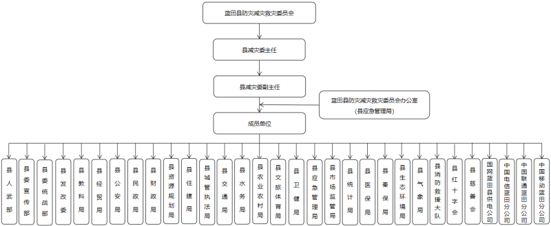 成员单位:县委宣传部、县委统战部、县人民武装部、县发改委、县教科局、县经贸局、县公安局、县民政局、县财政局、县资源规划局、县住建局、县城管执法局、县交通局、县水务局、县农业农村局、县文旅体育局、县卫健局、县应急管理局、县市场监管局、县统计局、县医保局、县秦保局、县消防救援大队、县生态环境局、县气象局、国网蓝田县供电公司、县红十字会、县慈善会、中国电信蓝田分公司、中国联通蓝田分公司、中国移动蓝田分公司。