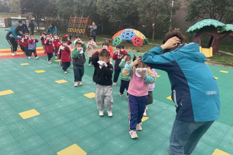 此次演练模拟场景设定为正在上课时,突发火灾。幼儿园园区内警报声响起,班级教师立即组织幼儿撤离。在老师的带领下,小朋友们迅速用湿毛巾捂住口鼻,弯腰小步快跑,有序逃到安全区域。全体师生到达安全地带后,立即清点人数并向总指挥汇报人数,确保师生全部安全撤离。