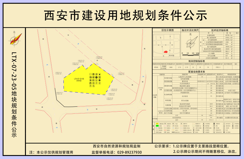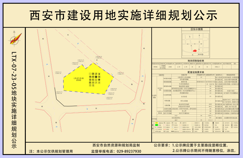 LTX-07-23-05地块(盛兴住宅)位于蓝田县蓝关街办,白鹿路以东,长坪路以南。本次实施详细规划主要指标:LTX-07-23-05净用地面积1.40ha,规划用地性质为二类城镇住宅用地(070102);容积率≤2.7、建筑密度≤20.00%、绿地率≥35%、建筑限高54米;停车位配建按照《蓝田县建设项目停车位配建标准(试行)》执行;配套设施及规划指标有关要求按照相关规定执行。