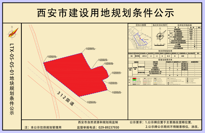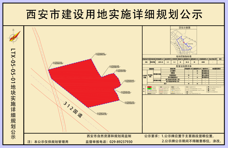 LTX05-05地块位于蓝田县三里镇三里村,312国道以北,二马路以西。本次实施详细规划主要指标:LTX05-05地块净用地面积1.41ha,规划用地性质为商业用地(代码0901);容积率≤3.3、建筑密度≤30%、绿地率≥35%、建筑限高80米;停车位配建按照《蓝田县建设项目停车位配建标准(试行)》执行。