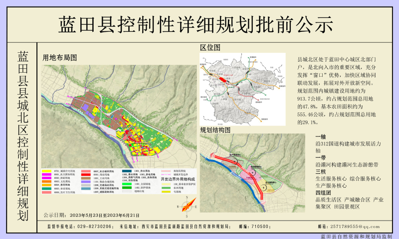 《蓝田县县城北区控制性详细规划》规划范围内城镇建设用地约为913.7公顷,约占规划范围总用地的47.8%,基本农田面积约为555.46公顷,约占规划范围总用地的29.1%。