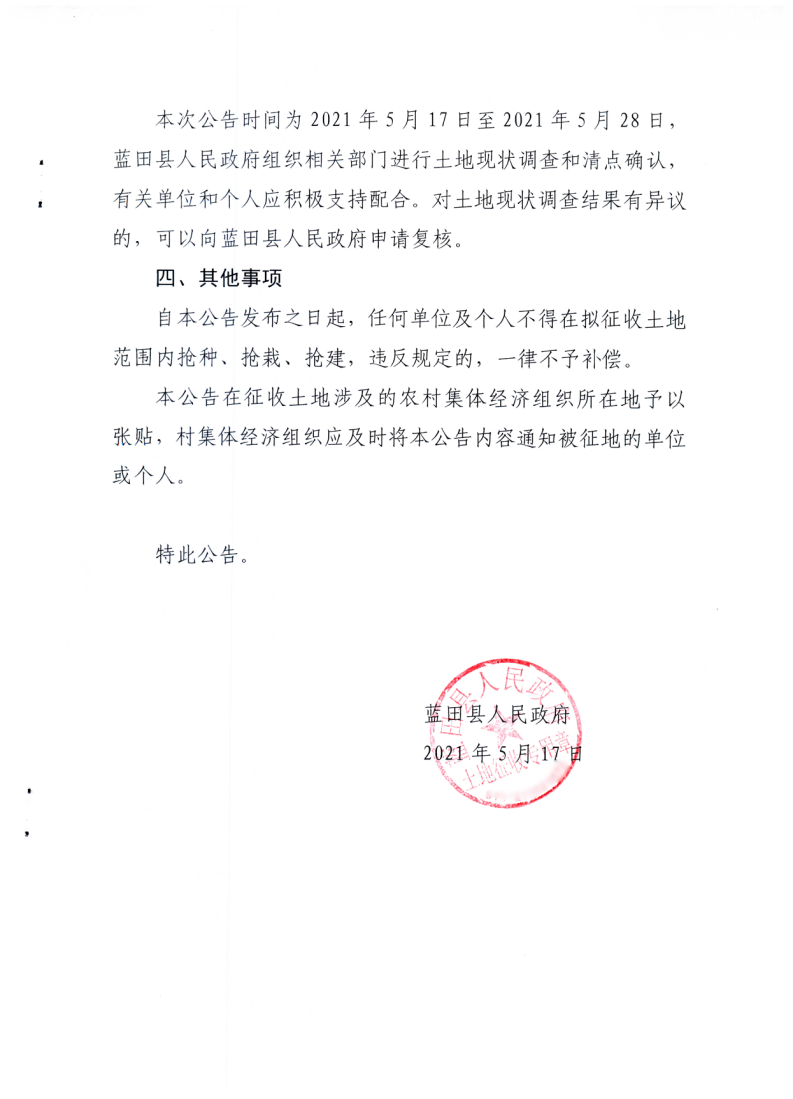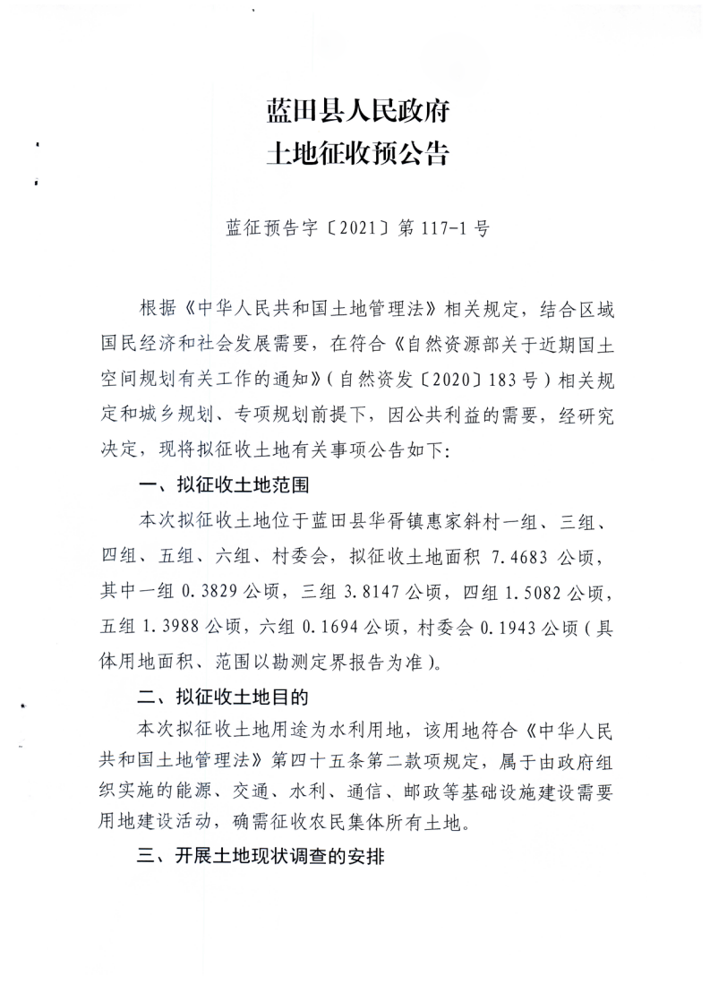 蓝田县人民政府土地征收预公告(蓝征预告字〔2021〕第117-1号)